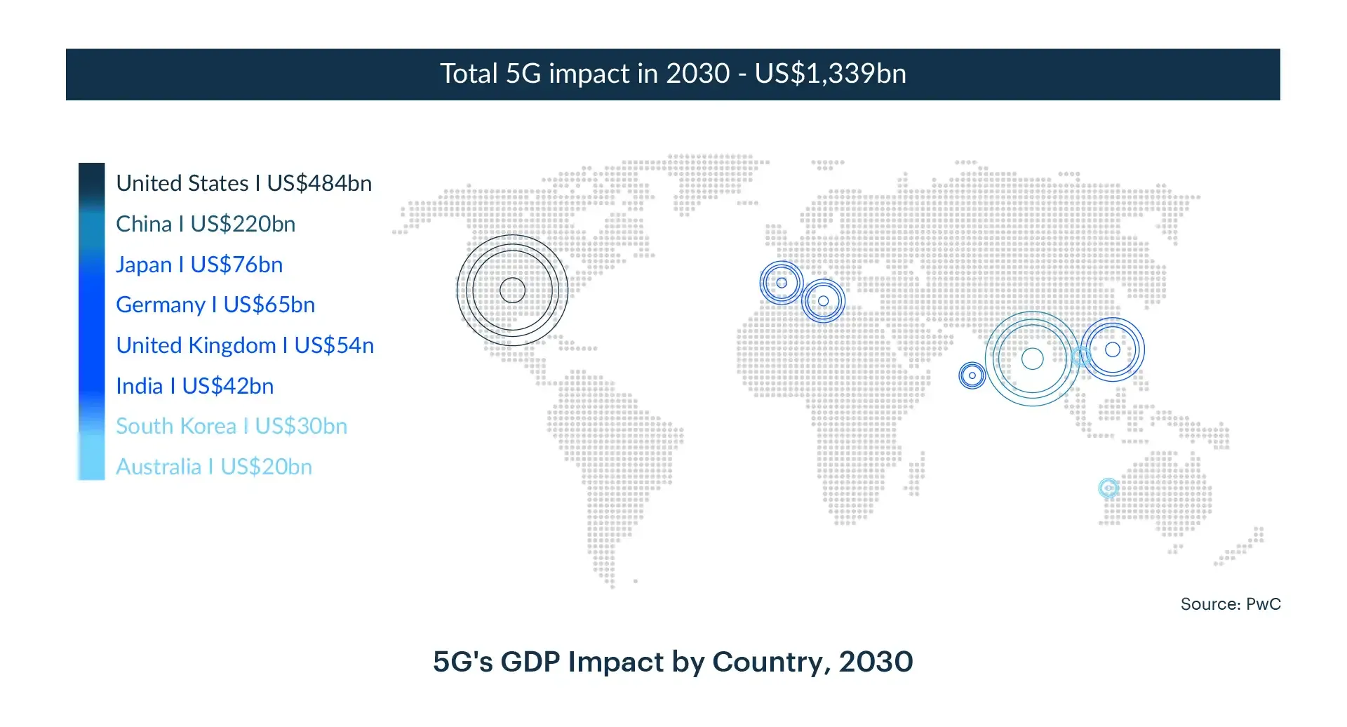 PwC projects about US$1.339T in 5G-driven GDP impact by 2030. The largest shares come from the United States (~US$484B) and China (~US$220B), followed by Japan (~US$76B), Germany (~US$65B), the UK (~US$54B), India (~US$42B), South Korea (~US$30B), and Australia (~US$20B). Read simply, value clusters in markets with early spectrum availability, enterprise adoption, and strong device ecosystems-signals that our near-term opportunities skew toward North America and East Asia, with Europe and India accelerating as standalone 5G and industry use cases mature.